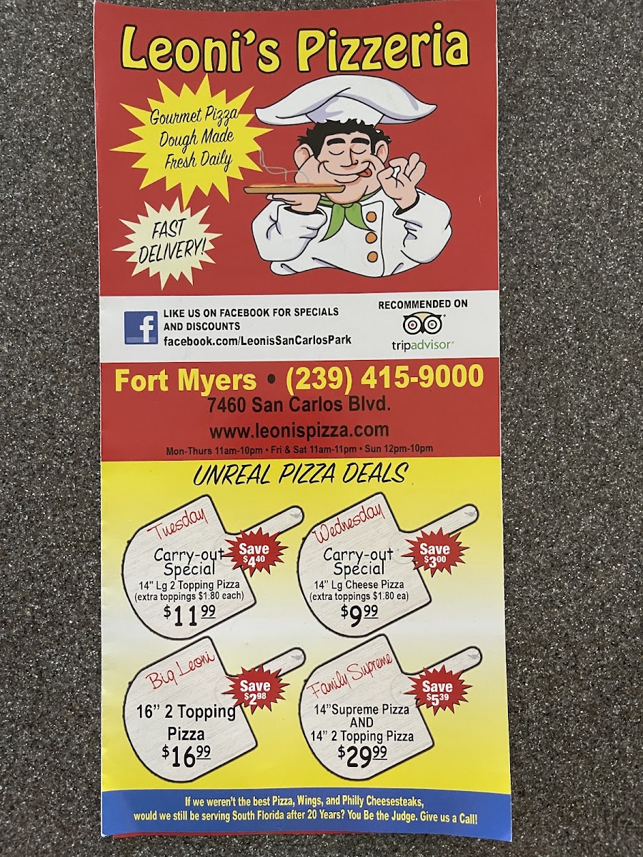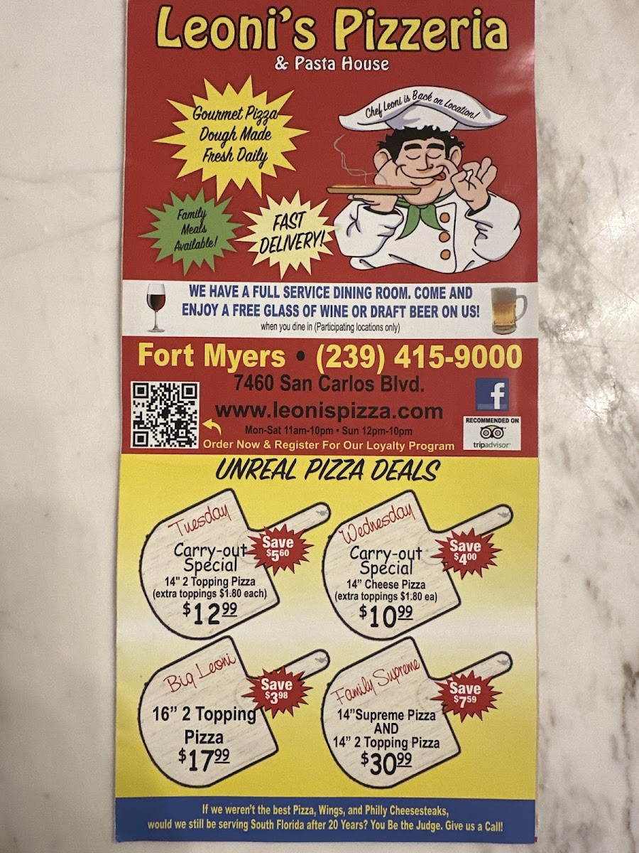 Welcome to Leoni's Pizzeria - Fort Myers, where the essence of Italian cuisine meets the warm spirit of family dining. Situated at 7460 San Carlos Blvd, this charming pizzeria is a favorite among locals and tourists alike. With rave reviews highlighting the deliciousness of their pizzas, it’s no wonder families flock here.